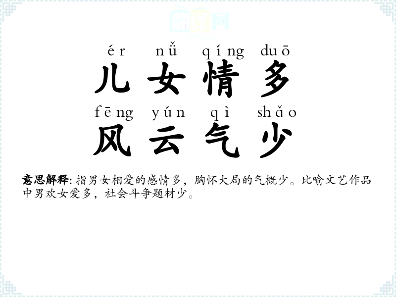 指男女相爱的感情多,胸怀大局的气概少。比喻文艺作品中男欢女爱多,社会斗争题材少。 |