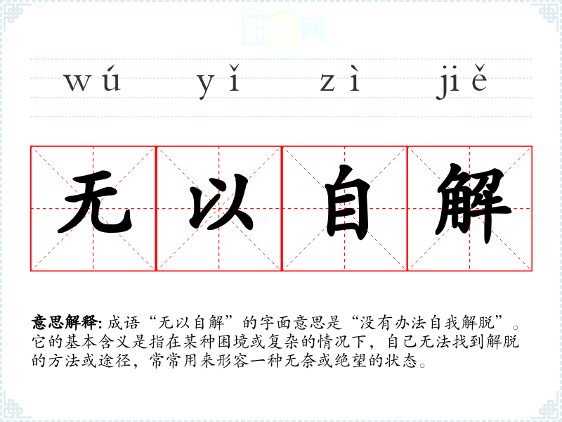 成语“无以自解”的字面意思是“没有办法自我解脱”。它的基本含义是指在某种困境或复杂的情况下,自己无法找到解脱的方法或途径,常常用来形容一种无奈或绝望的状态。