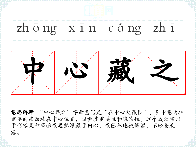“中心藏之”字面意思是“在中心处藏匿”,引申意为把重要的东西放在中心位置,强调其重要性和隐蔽性。这个成语常用于形容某种事物或思想深藏于内心,或隐秘地被保留,不轻易表露。