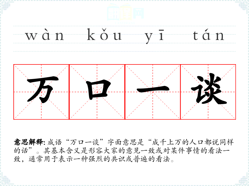 成语“万口一谈”字面意思是“成千上万的人口都说同样的话”。其基本含义是形容大家的意见一致或对某件事情的看法一致,通常用于表示一种强烈的共识或普遍的看法。