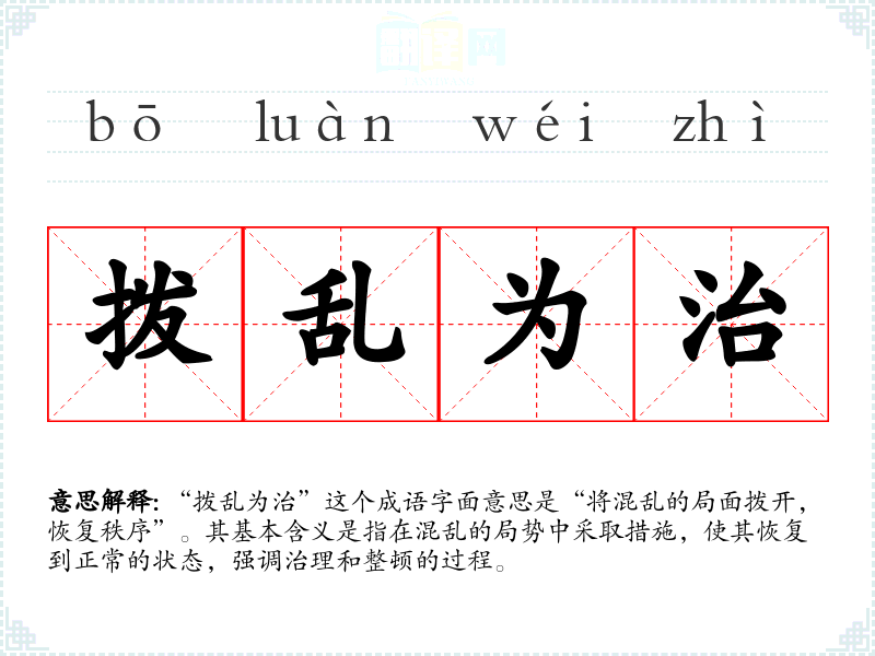 “拨乱为治”这个成语字面意思是“将混乱的局面拨开,恢复秩序”。其基本含义是指在混乱的局势中采取措施,使其恢复到正常的状态,强调治理和整顿的过程。