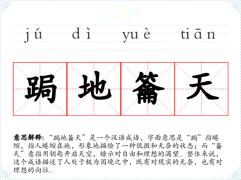 “跼地籥天”是一个汉语成语,字面意思是“跼”指蜷缩,指人蜷缩在地,形象地描绘了一种低微和无奈的状态;而“籥天”意指用钥匙开启天空,暗示对自由和理想的渴望。整体来说,这个成语描述了人处于极为困境之中,既有对现实的无奈,也有对理想的向往。