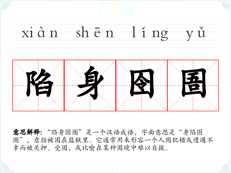 “陷身囹圄”是一个汉语成语,字面意思是“身陷囹圄”,意指被困在监狱里。它通常用来形容一个人因犯错或遭遇不幸而被关押、受困,或比喻在某种困境中难以自拔。