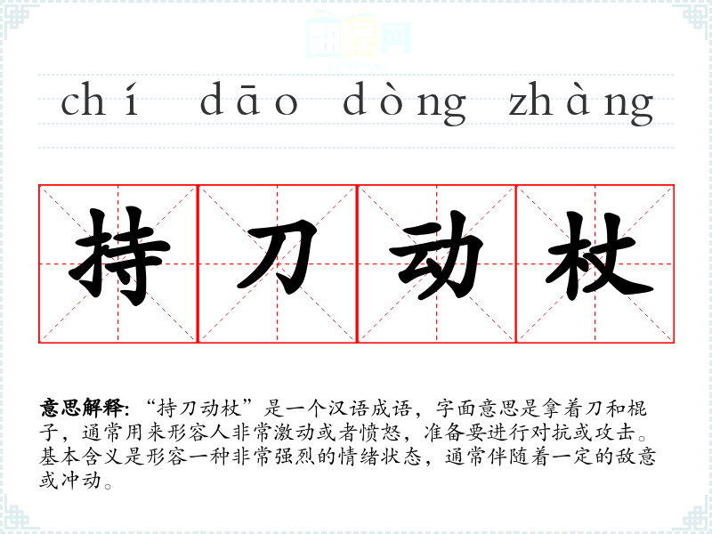 “持刀动杖”是一个汉语成语,字面意思是拿着刀和棍子,通常用来形容人非常激动或者愤怒,准备要进行对抗或攻击。基本含义是形容一种非常强烈的情绪状态,通常伴随着一定的敌意或冲动。