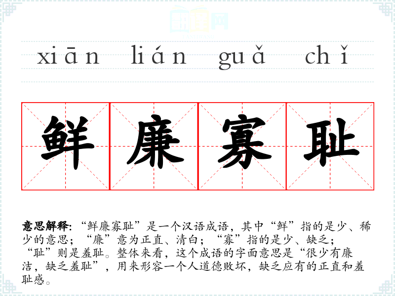 “鲜廉寡耻”是一个汉语成语,其中“鲜”指的是少、稀少的意思;“廉”意为正直、清白;“寡”指的是少、缺乏;“耻”则是羞耻。整体来看,这个成语的字面意思是“很少有廉洁,缺乏羞耻”,用来形容一个人道德败坏,缺乏应有的正直和羞耻感。