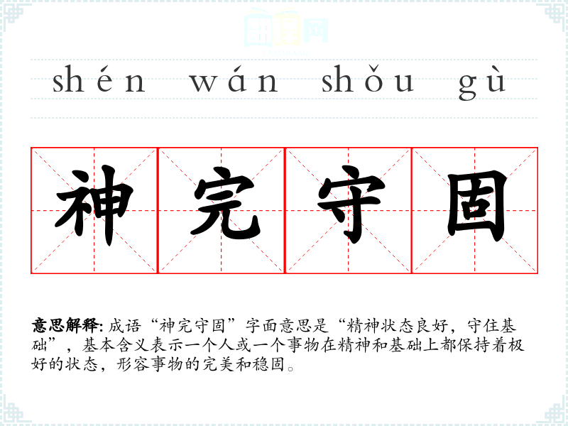 成语“神完守固”字面意思是“精神状态良好,守住基础”,基本含义表示一个人或一个事物在精神和基础上都保持着极好的状态,形容事物的完美和稳固。