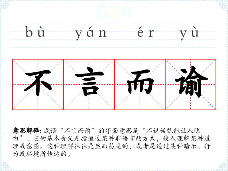 成语“不言而谕”的字面意思是“不说话就能让人明白”。它的基本含义是指通过某种非语言的方式,使人理解某种道理或意图。这种理解往往是显而易见的,或者是通过某种暗示、行为或环境所传达的。