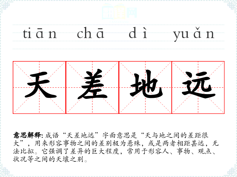 成语“天差地远”字面意思是“天与地之间的差距很大”,用来形容事物之间的差别极为悬殊,或是两者相距甚远,无法比拟。它强调了差异的巨大程度,常用于形容人、事物、观点、状况等之间的天壤之别。