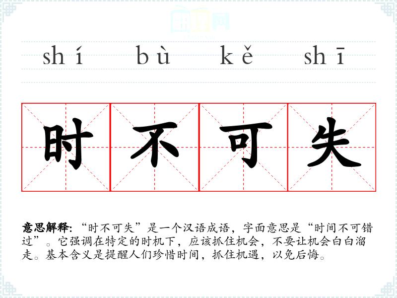 | 时不可失 | 时:时机,机会;失:错过。抓住时机,不可错过。 |