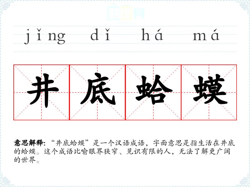 “井底蛤蟆”是一个汉语成语,字面意思是指生活在井底的蛤蟆。这个成语比喻眼界狭窄、见识有限的人,无法了解更广阔的世界。
