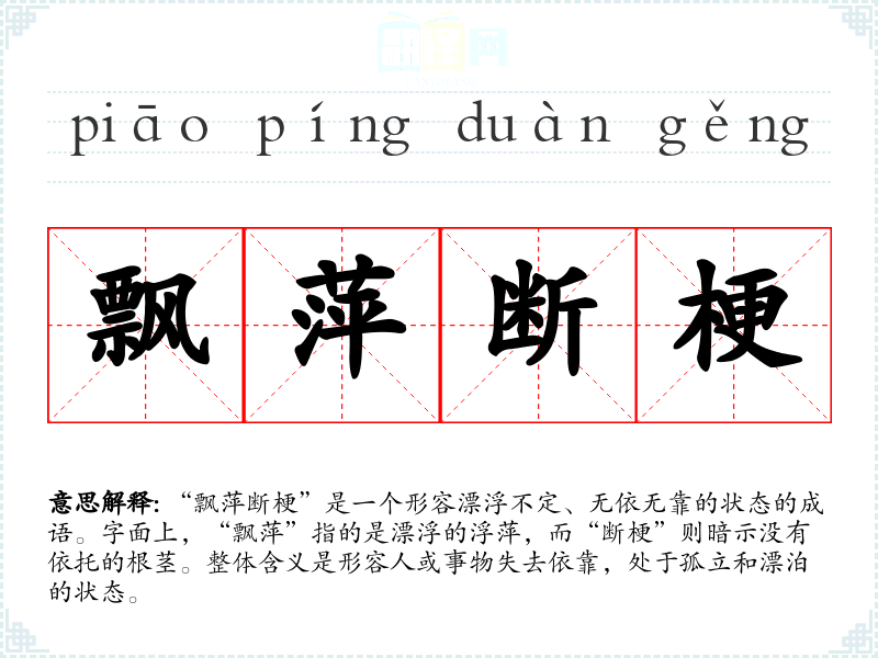 通过对“飘萍断梗”的学,我对这个成语有了更深刻的理解。它不仅是一个形容孤独的成语,更是一种对人类生存状态的反思。在语言学和表达中,了解和使用这样的成语能够丰富我们的表达方式,也让我们更好地理解他人的情感与经历。