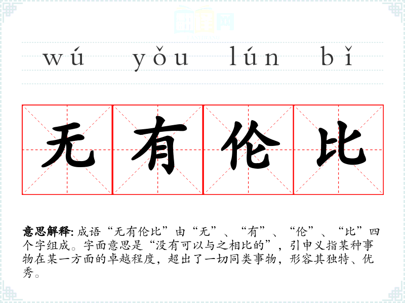 成语“无有伦比”由“无”、“有”、“伦”、“比”四个字组成。字面意思是“没有可以与之相比的”,引申义指某种事物在某一方面的卓越程度,超出了一切同类事物,形容其独特、优秀。