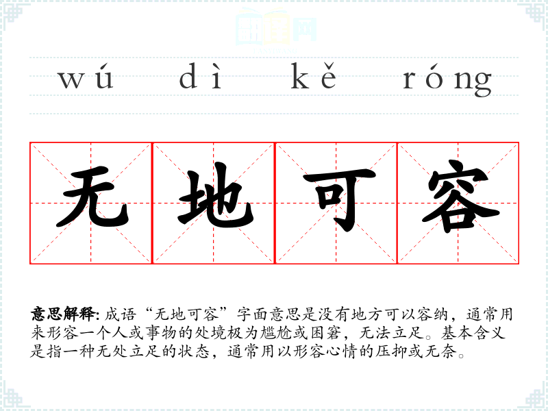 成语“无地可容”字面意思是没有地方可以容纳,通常用来形容一个人或事物的处境极为尴尬或困窘,无法立足。基本含义是指一种无处立足的状态,通常用以形容心情的压抑或无奈。