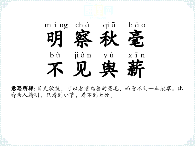 目光敏锐,可以看清鸟兽的毫毛,而看不到一车柴草。比喻为人精明,只看到小节,看不到大处。 |