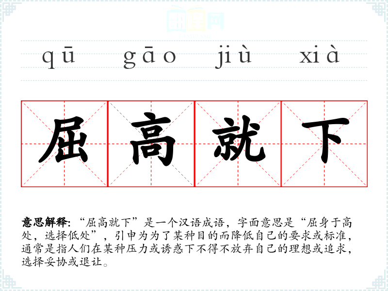 “屈高就下”是一个汉语成语,字面意思是“屈身于高处,选择低处”,引申为为了某种目的而降低自己的要求或标准,通常是指人们在某种压力或诱惑下不得不放弃自己的理想或追求,选择妥协或退让。