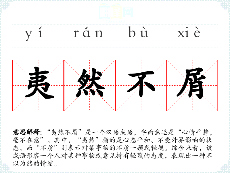 这个成语给人一种淡然从容的感觉,令人联想到一种超然的智慧。在生活中,能够做到“夷然不屑”是一种内心强大的表现,能够帮助人们理清思路,专注于真正重要的事情。