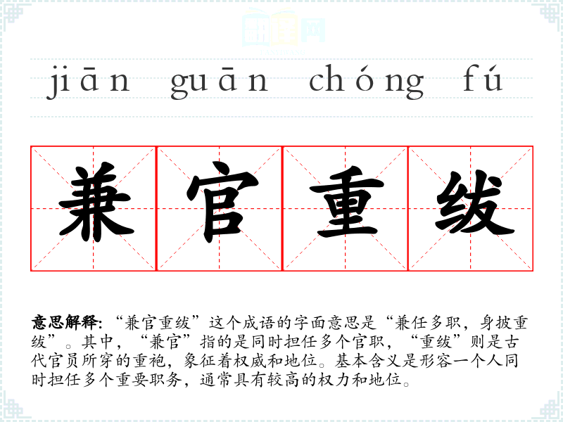 “兼官重绂”这个成语的字面意思是“兼任多职,身披重绂”。其中,“兼官”指的是同时担任多个官职,“重绂”则是古代官员所穿的重袍,象征着权威和地位。基本含义是形容一个人同时担任多个重要职务,通常具有较高的权力和地位。