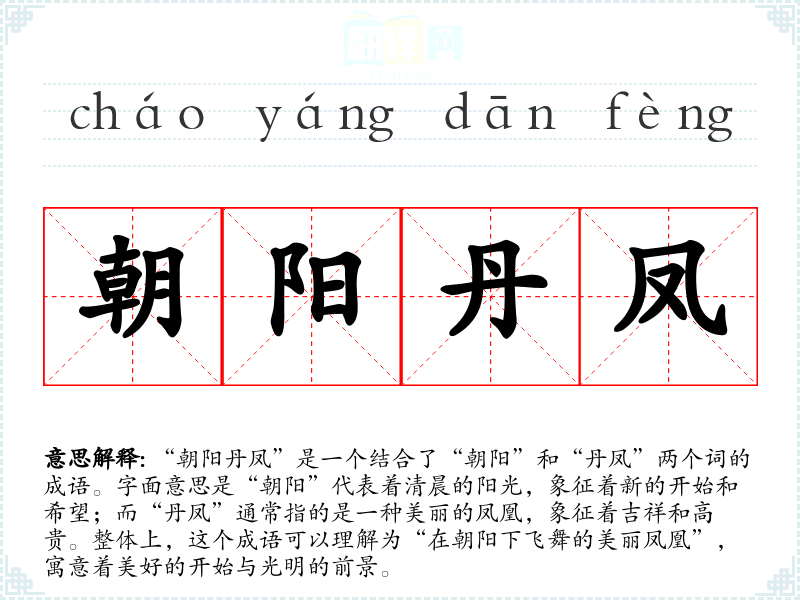 “朝阳丹凤”是一个结合了“朝阳”和“丹凤”两个词的成语。字面意思是“朝阳”代表着清晨的阳光,象征着新的开始和希望;而“丹凤”通常指的是一种美丽的凤凰,象征着吉祥和高贵。整体上,这个成语可以理解为“在朝阳下飞舞的美丽凤凰”,寓意着美好的开始与光明的前景。