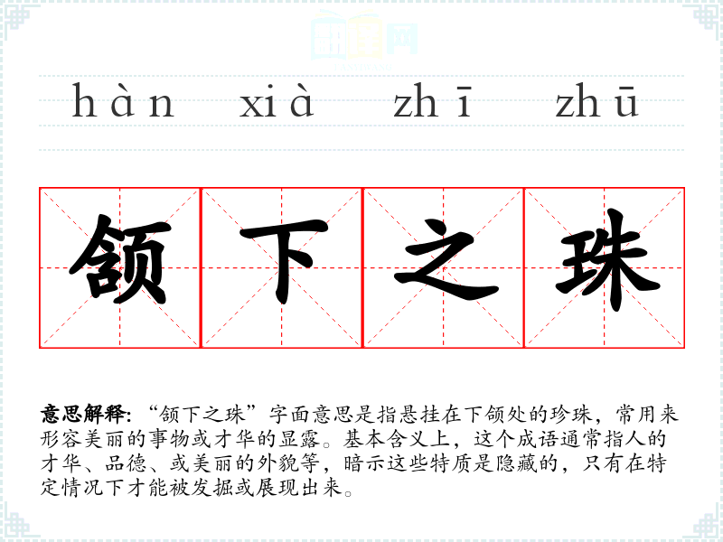 “颔下之珠”字面意思是指悬挂在下颌处的珍珠,常用来形容美丽的事物或才华的显露。基本含义上,这个成语通常指人的才华、品德、或美丽的外貌等,暗示这些特质是隐藏的,只有在特定情况下才能被发掘或展现出来。