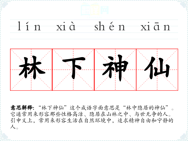 “林下神仙”这个成语字面意思是“林中隐居的神仙”。它通常用来形容那些性格高洁、隐居在山林之中、与世无争的人。引申义上,常用来形容生活在自然环境中,追求精神自由和宁静的人。