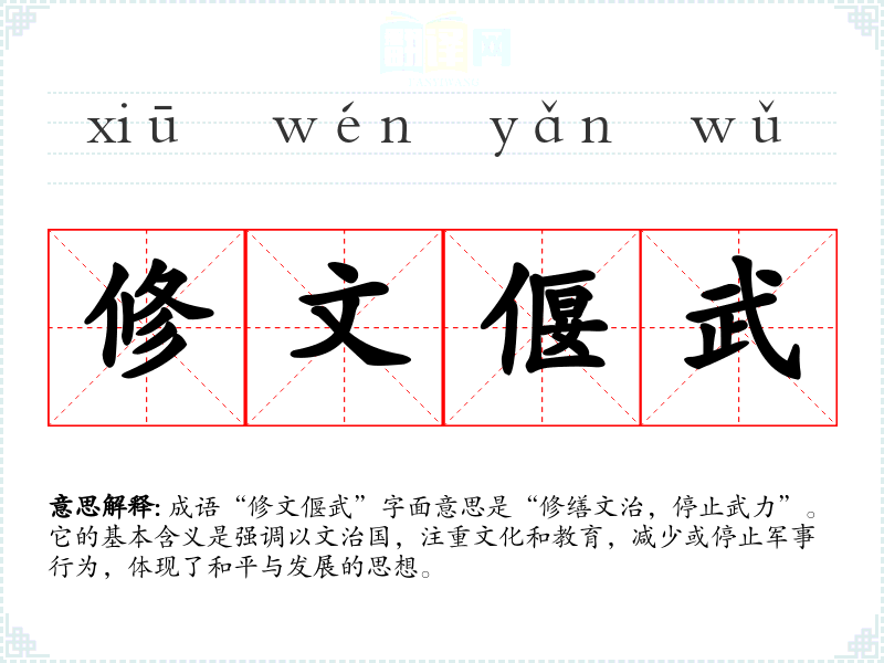 成语“修文偃武”字面意思是“修缮文治,停止武力”。它的基本含义是强调以文治国,注重文化和教育,减少或停止军事行为,体现了和平与发展的思想。
