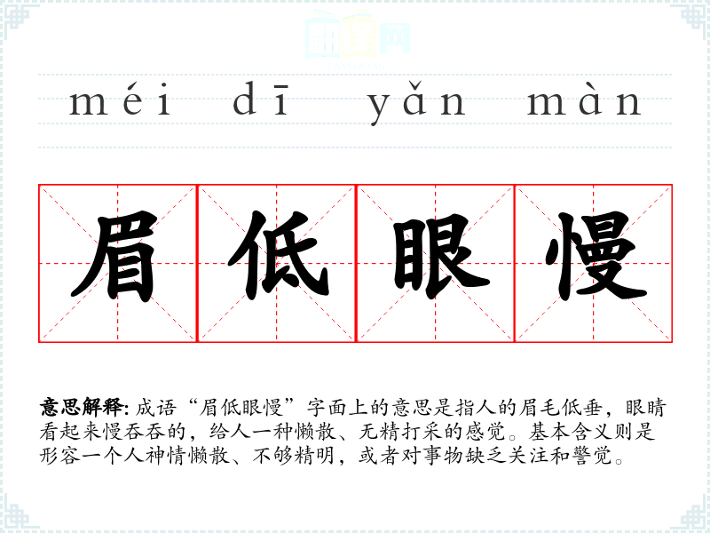 成语“眉低眼慢”字面上的意思是指人的眉毛低垂,眼睛看起来慢吞吞的,给人一种懒散、无精打采的感觉。基本含义则是形容一个人神情懒散、不够精明,或者对事物缺乏关注和警觉。