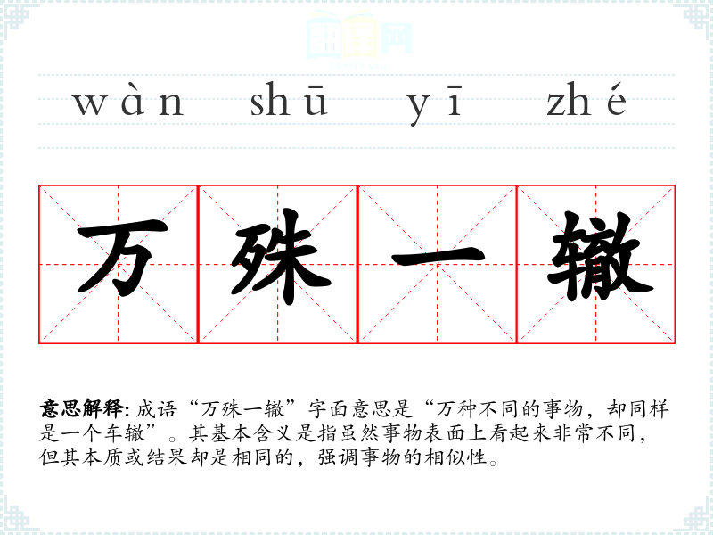 成语“万殊一辙”字面意思是“万种不同的事物,却同样是一个车辙”。其基本含义是指虽然事物表面上看起来非常不同,但其本质或结果却是相同的,强调事物的相似性。