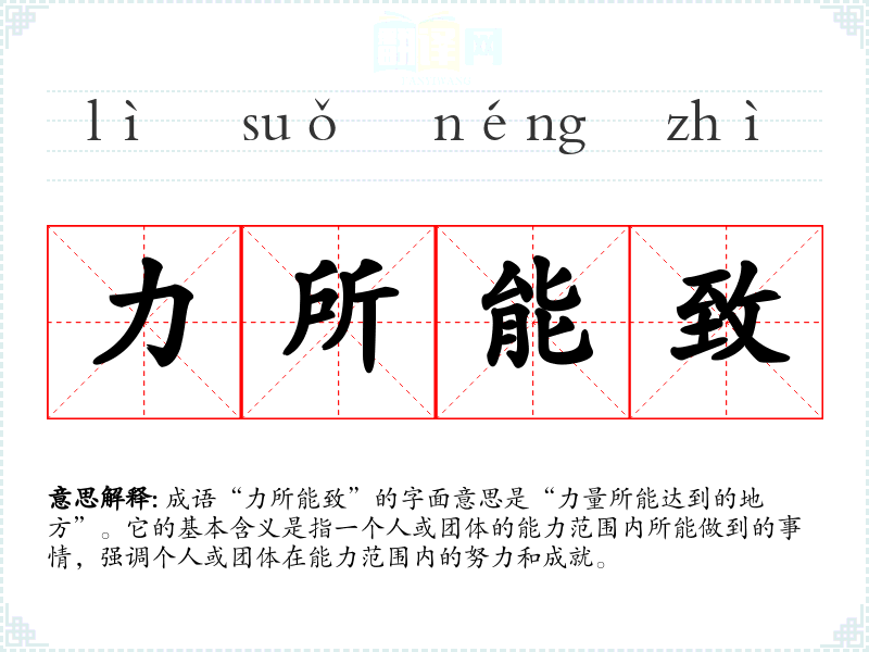 成语“力所能致”的字面意思是“力量所能达到的地方”。它的基本含义是指一个人或团体的能力范围内所能做到的事情,强调个人或团体在能力范围内的努力和成就。