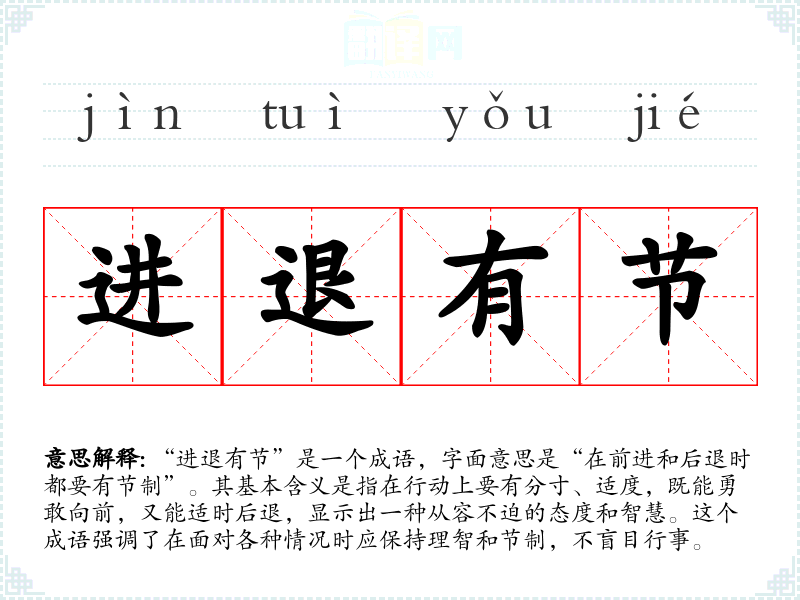 在英语中,可以用“balance”或“moderation”来表达类似的意思,强调在行动中保持平衡。在西方文化中,虽然有相似的概念,但更多强调的是个人的选择和决策能力,可能不如“进退有节”强调礼仪和节制。