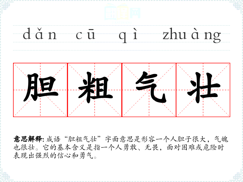 成语“胆粗气壮”字面意思是形容一个人胆子很大,气魄也很壮。它的基本含义是指一个人勇敢、无畏,面对困难或危险时表现出强烈的信心和勇气。