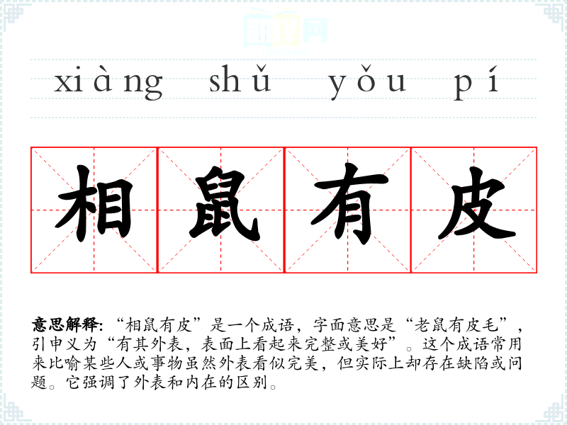 “相鼠有皮”是一个成语,字面意思是“老鼠有皮毛”,引申义为“有其外表,表面上看起来完整或美好”。这个成语常用来比喻某些人或事物虽然外表看似完美,但实际上却存在缺陷或问题。它强调了外表和内在的区别。