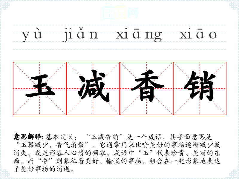 基本定义: “玉减香销”是一个成语,其字面意思是“玉器减少,香气消散”。它通常用来比喻美好的事物逐渐减少或消失,或是形容人心情的凋零。成语中“玉”代表珍贵、美丽的东西,而“香”则象征着美好、愉悦的事物,组合在一起形象地表达了美好事物的消逝。
