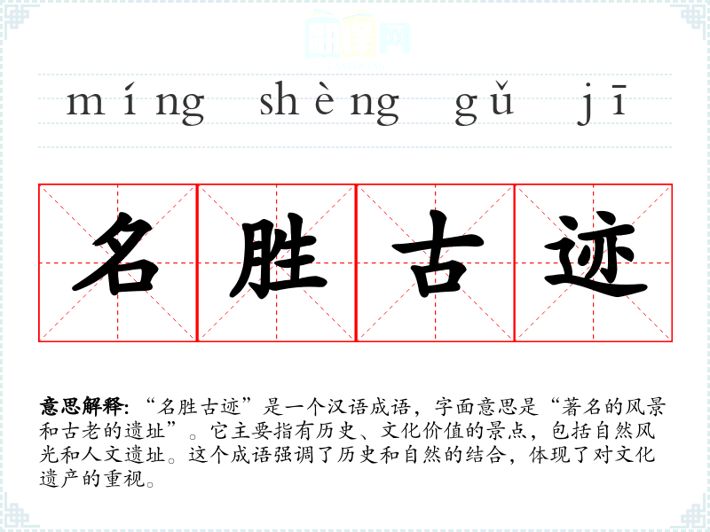“名胜古迹”是一个汉语成语,字面意思是“著名的风景和古老的遗址”。它主要指有历史、文化价值的景点,包括自然风光和人文遗址。这个成语强调了历史和自然的结合,体现了对文化遗产的重视。