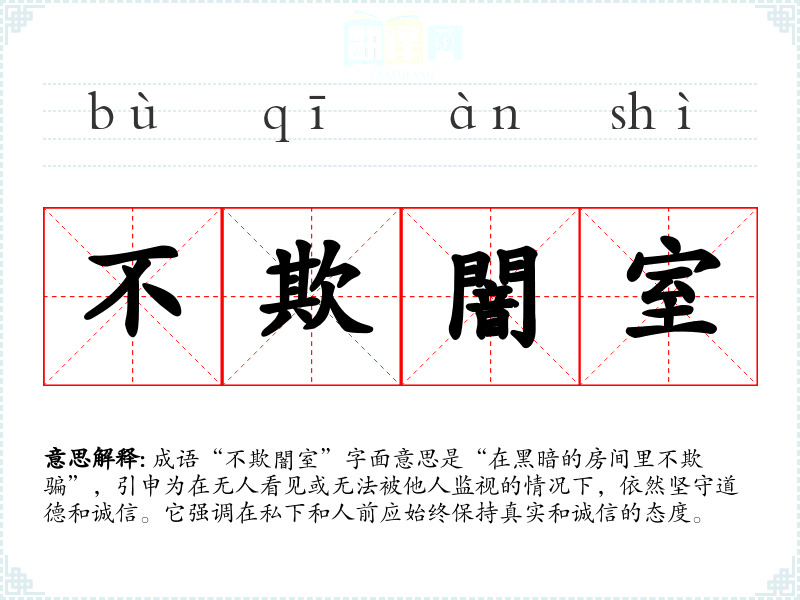成语“不欺闇室”字面意思是“在黑暗的房间里不欺骗”,引申为在无人看见或无法被他人监视的情况下,依然坚守道德和诚信。它强调在私下和人前应始终保持真实和诚信的态度。