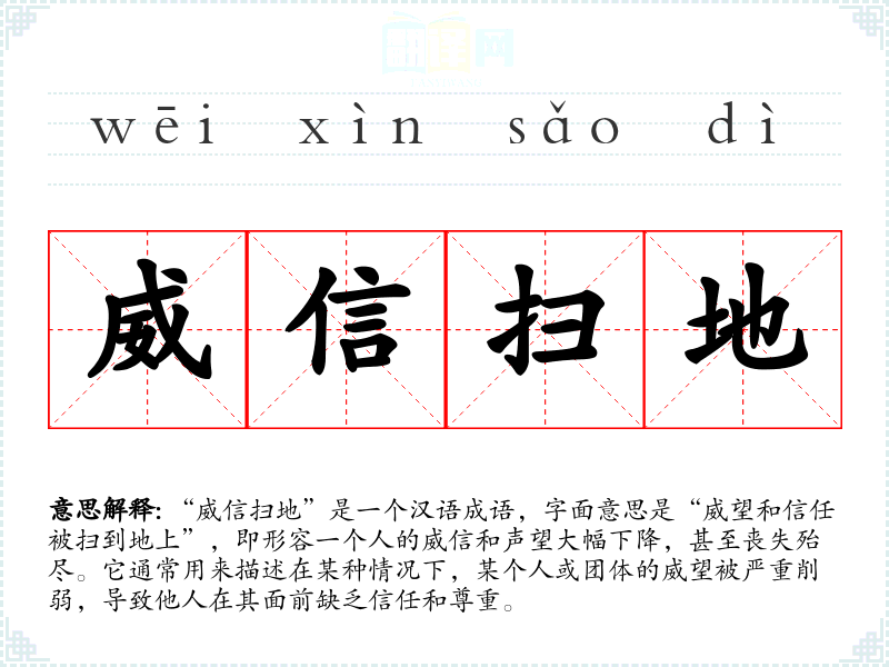 | 威信扫地 | 威信:威望和信誉。威望、信誉全部丧失。比喻威望和信誉完全丧失。 |