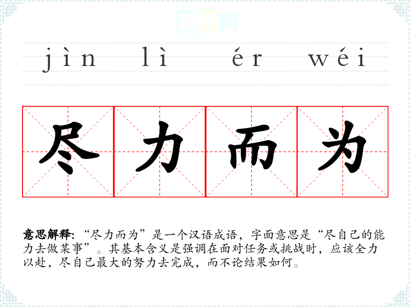“尽力而为”是一个汉语成语,字面意思是“尽自己的能力去做某事”。其基本含义是强调在面对任务或挑战时,应该全力以赴,尽自己最大的努力去完成,而不论结果如何。