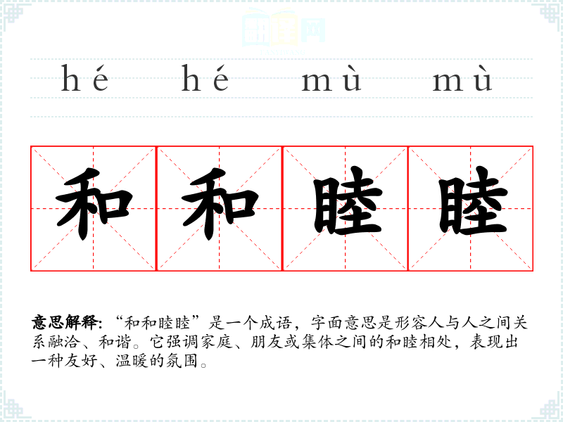 该成语的起源并没有明确的历史典故,但其构成的两个“和”字与“睦”字均与和谐、和平相关,体现了**文化中对家庭团结和社会和谐的重视。在古代文献中,类似的描述常常用来赞美理想的社会状态和家庭关系。