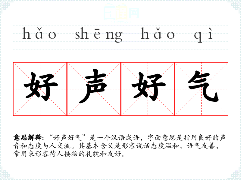 “好声好气”是一个汉语成语,字面意思是指用良好的声音和态度与人交流。其基本含义是形容说话态度温和,语气友善,常用来形容待人接物的礼貌和友好。