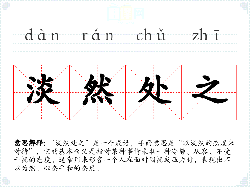 “淡然处之”是一个成语,字面意思是“以淡然的态度来对待”,它的基本含义是指对某种事情采取一种冷静、从容、不受干扰的态度。通常用来形容一个人在面对困扰或压力时,表现出不以为然、心态平和的态度。