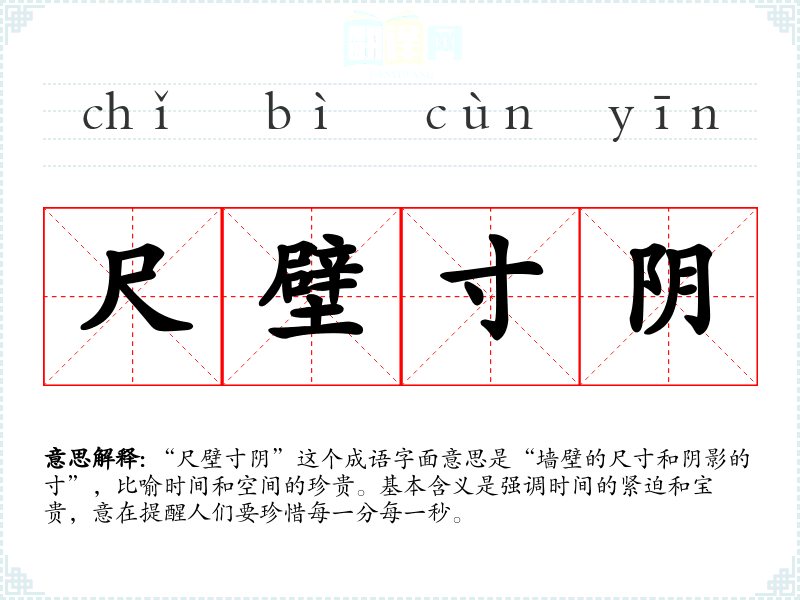 | 尺壁寸阴 | 阴:日影,光阴;寸阴:指极断的时间。日影移动一寸的时间价值比径尺的璧玉还要珍贵。极言时间可贵。 |