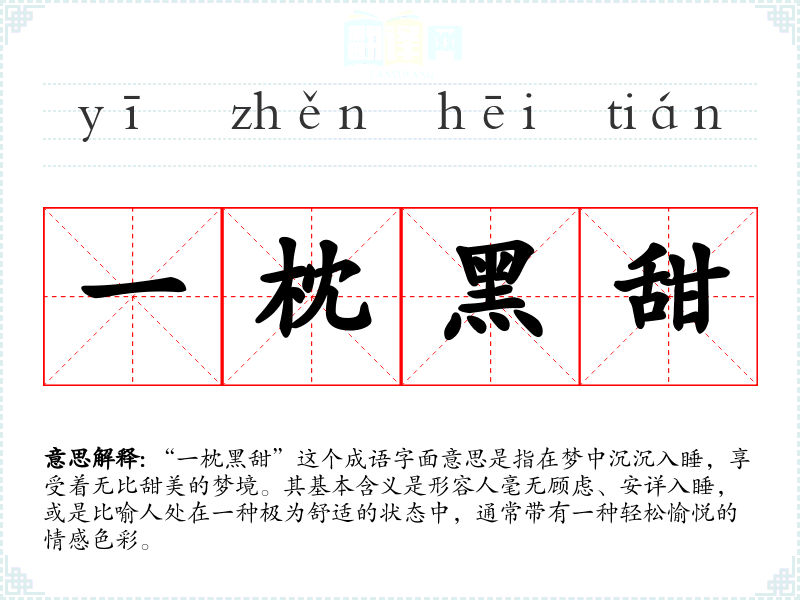 “一枕黑甜”这个成语字面意思是指在梦中沉沉入睡,享受着无比甜美的梦境。其基本含义是形容人毫无顾虑、安详入睡,或是比喻人处在一种极为舒适的状态中,通常带有一种轻松愉悦的情感色彩。