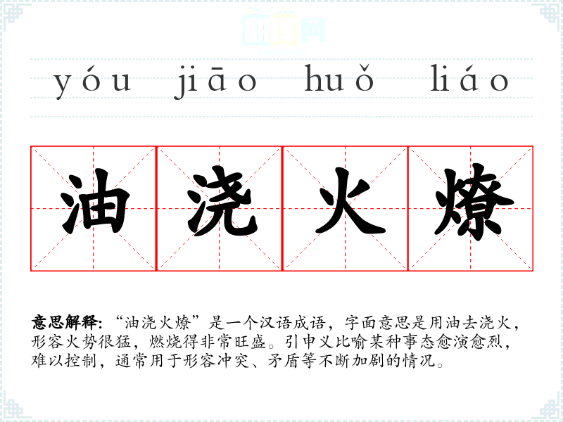 “油浇火燎”是一个汉语成语,字面意思是用油去浇火,形容火势很猛,燃烧得非常旺盛。引申义比喻某种事态愈演愈烈,难以控制,通常用于形容冲突、矛盾等不断加剧的情况。