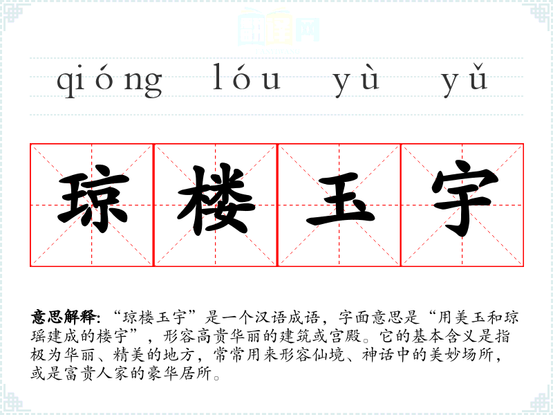 | 琼楼玉宇 | 琼:美玉;宇:房屋。指月中宫殿,仙界楼台。也形容富丽堂皇的建筑物。 |