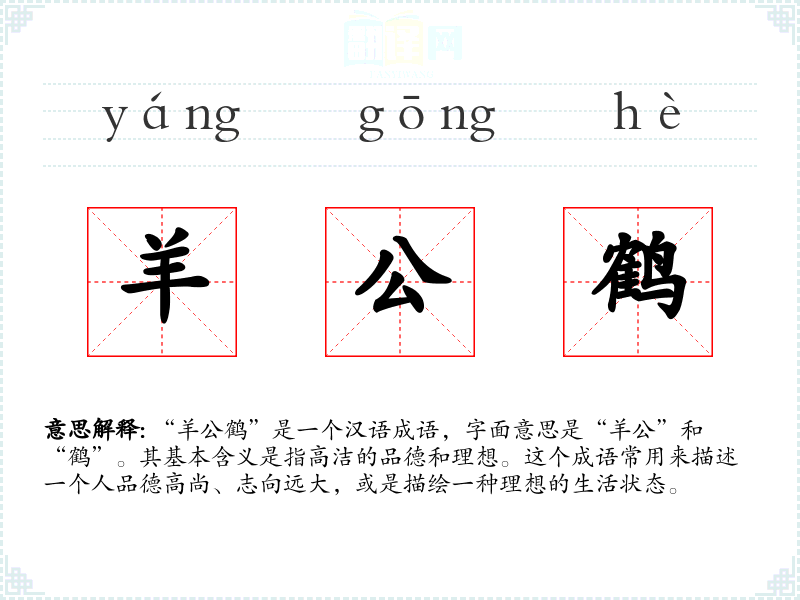 “羊公鹤”是一个汉语成语,字面意思是“羊公”和“鹤”。其基本含义是指高洁的品德和理想。这个成语常用来描述一个人品德高尚、志向远大,或是描绘一种理想的生活状态。
