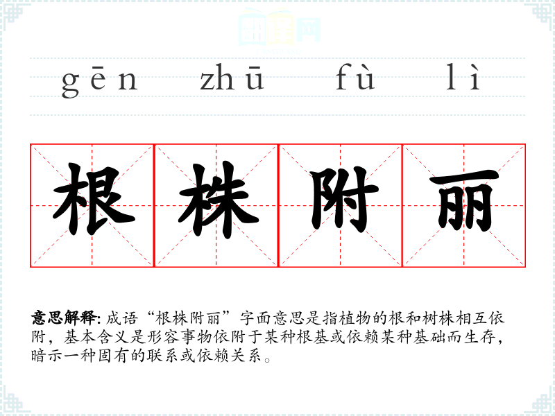 成语“根株附丽”字面意思是指植物的根和树株相互依附,基本含义是形容事物依附于某种根基或依赖某种基础而生存,暗示一种固有的联系或依赖关系。