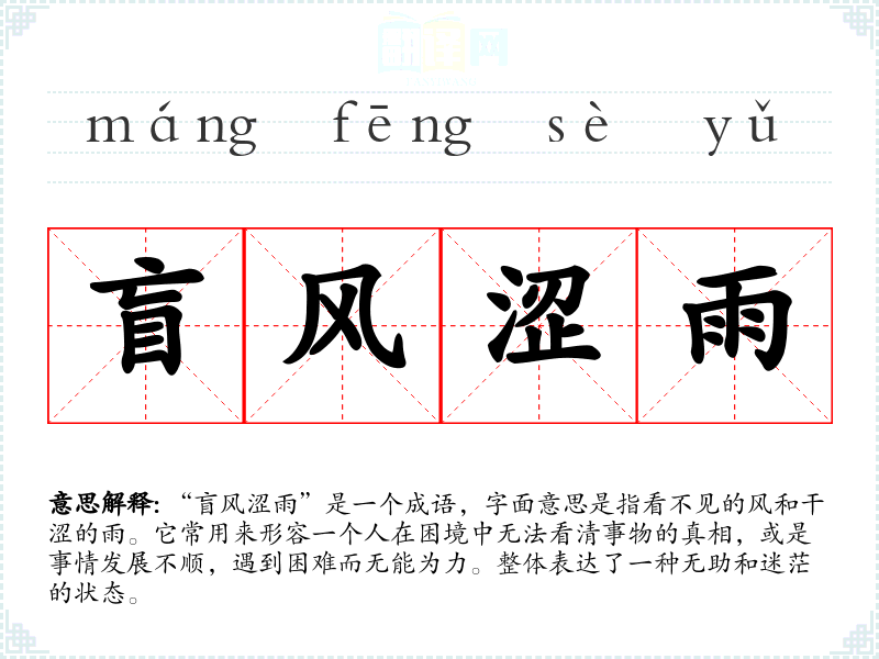 “盲风涩雨”是一个成语,字面意思是指看不见的风和干涩的雨。它常用来形容一个人在困境中无法看清事物的真相,或是事情发展不顺,遇到困难而无能为力。整体表达了一种无助和迷茫的状态。