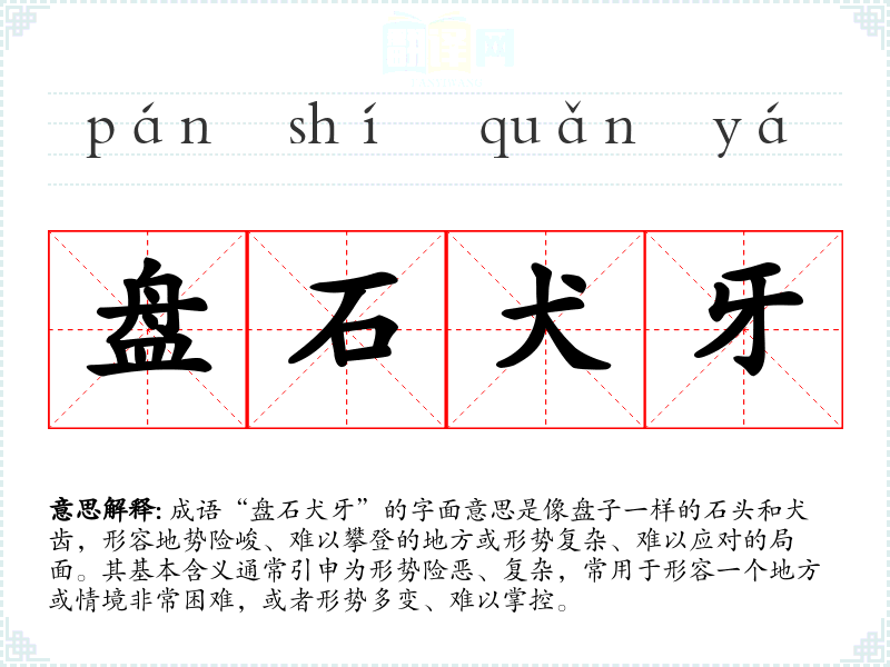 成语“盘石犬牙”的字面意思是像盘子一样的石头和犬齿,形容地势险峻、难以攀登的地方或形势复杂、难以应对的局面。其基本含义通常引申为形势险恶、复杂,常用于形容一个地方或情境非常困难,或者形势多变、难以掌控。