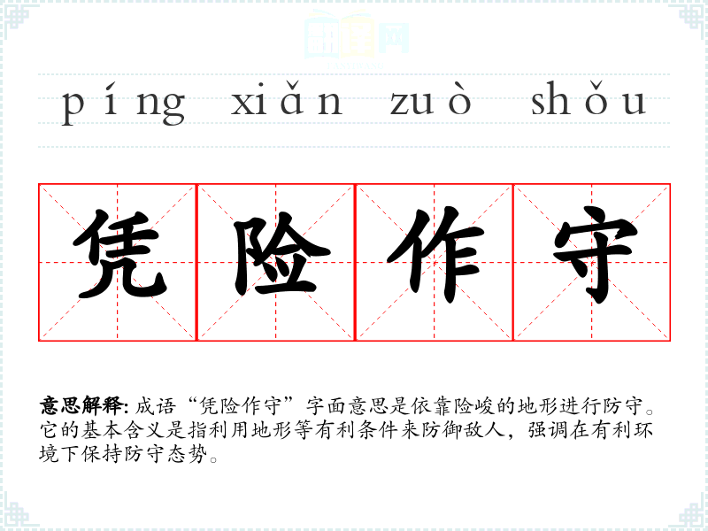 成语“凭险作守”字面意思是依靠险峻的地形进行防守。它的基本含义是指利用地形等有利条件来防御敌人,强调在有利环境下保持防守态势。