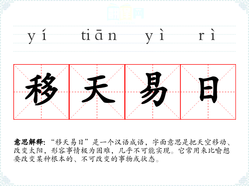 “移天易日”是一个汉语成语,字面意思是把天空移动、改变太阳,形容事情极为困难,几乎不可能实现。它常用来比喻想要改变某种根本的、不可改变的事物或状态。