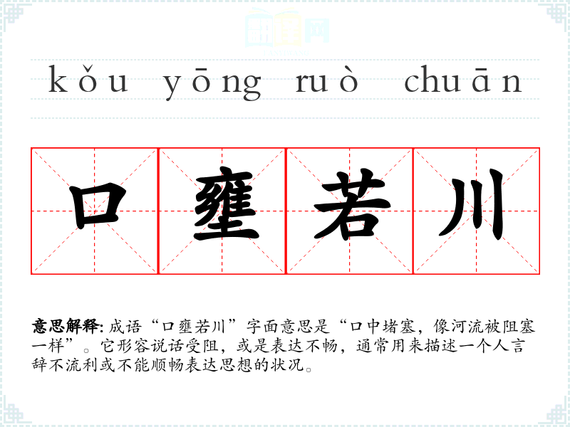 成语“口壅若川”字面意思是“口中堵塞,像河流被阻塞一样”。它形容说话受阻,或是表达不畅,通常用来描述一个人言辞不流利或不能顺畅表达思想的状况。